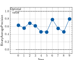 >>> # Example plotting multiple values >>> import torch >>> from torchmetrics.classification import BinaryAveragePrecision >>> metric = BinaryAveragePrecision() >>> values = [ ] >>> for _ in range(10): ... values.append(metric(torch.rand(20,), torch.randint(2, (20,)))) >>> fig_, ax_ = metric.plot(values)