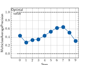 >>> # Example plotting multiple values >>> import torch >>> from torchmetrics.classification import MulticlassAveragePrecision >>> metric = MulticlassAveragePrecision(num_classes=3) >>> values = [ ] >>> for _ in range(10): ... values.append(metric(torch.randn(20, 3), torch.randint(3, (20,)))) >>> fig_, ax_ = metric.plot(values)