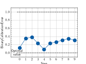 \[\text{ECE} = \sum_i^N b_i \|(p_i - c_i)\|, \text{L1 norm (Expected Calibration Error)}\]\[\text{MCE} = \max_{i} (p_i - c_i), \text{Infinity norm (Maximum Calibration Error)}\]\[\text{RMSCE} = \sqrt{\sum_i^N b_i(p_i - c_i)^2}, \text{L2 norm (Root Mean Square Calibration Error)}\]Where \(p_i\) is the top-1 prediction accuracy in bin \(i\), \(c_i\) is the average confidence of predictions in bin \(i\), and \(b_i\) is the fraction of data points in bin \(i\). Bins are constructed in an uniform way in the [0,1] range.