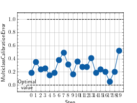 >>> from torch import randn, randint >>> # Example plotting a multiple values >>> from torchmetrics.classification import MulticlassCalibrationError >>> metric = MulticlassCalibrationError(num_classes=3, n_bins=3, norm='l1') >>> values = [] >>> for _ in range(20): ... values.append(metric(randn(20,3).softmax(dim=-1), randint(3, (20,)))) >>> fig_, ax_ = metric.plot(values)