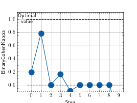 >>> from torch import rand, randint >>> # Example plotting multiple values >>> from torchmetrics.classification import BinaryCohenKappa >>> metric = BinaryCohenKappa() >>> values = [ ] >>> for _ in range(10): ... values.append(metric(rand(10), randint(2,(10,)))) >>> fig_, ax_ = metric.plot(values)