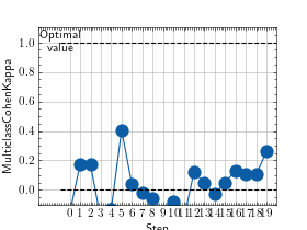 >>> from torch import randn, randint >>> # Example plotting a multiple values >>> from torchmetrics.classification import MulticlassCohenKappa >>> metric = MulticlassCohenKappa(num_classes=3) >>> values = [] >>> for _ in range(20): ... values.append(metric(randn(20,3).softmax(dim=-1), randint(3, (20,)))) >>> fig_, ax_ = metric.plot(values)