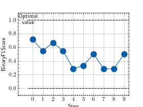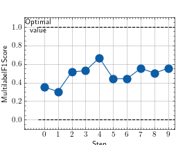 >>> from torch import rand, randint >>> # Example plotting multiple values >>> from torchmetrics.classification import BinaryF1Score >>> metric = BinaryF1Score() >>> values = [ ] >>> for _ in range(10): ... values.append(metric(rand(10), randint(2,(10,)))) >>> fig_, ax_ = metric.plot(values)