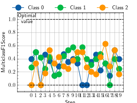 >>> from torch import rand, randint >>> # Example plotting multiple values >>> from torchmetrics.classification import MultilabelF1Score >>> metric = MultilabelF1Score(num_labels=3) >>> values = [ ] >>> for _ in range(10): ... values.append(metric(randint(2, (20, 3)), randint(2, (20, 3)))) >>> fig_, ax_ = metric.plot(values)