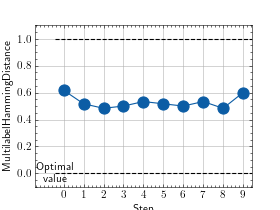 \[\text{Hamming distance} = \frac{1}{N \cdot L} \sum_i^N \sum_l^L 1(y_{il} \neq \hat{y}_{il})\]Where \(y\) is a tensor of target values, \(\hat{y}\) is a tensor of predictions, and \(\bullet_{il}\) refers to the \(l\)-th label of the \(i\)-th sample of that tensor.