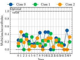 >>> # Example plotting a multiple values per class >>> from torch import randint >>> from torchmetrics.classification import MulticlassJaccardIndex >>> metric = MulticlassJaccardIndex(num_classes=3, average=None) >>> values = [] >>> for _ in range(20): ... values.append(metric(randint(3, (20,)), randint(3, (20,)))) >>> fig_, ax_ = metric.plot(values)