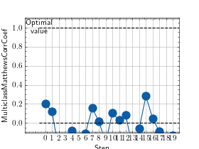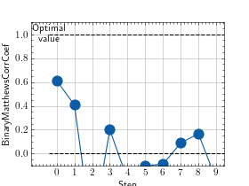 >>> from torch import rand, randint >>> # Example plotting multiple values >>> from torchmetrics.classification import BinaryMatthewsCorrCoef >>> metric = BinaryMatthewsCorrCoef() >>> values = [ ] >>> for _ in range(10): ... values.append(metric(rand(10), randint(2,(10,)))) >>> fig_, ax_ = metric.plot(values)