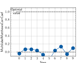 >>> from torch import rand, randint >>> # Example plotting multiple values >>> from torchmetrics.classification import MultilabelMatthewsCorrCoef >>> metric = MultilabelMatthewsCorrCoef(num_labels=3) >>> values = [ ] >>> for _ in range(10): ... values.append(metric(randint(2, (20, 3)), randint(2, (20, 3)))) >>> fig_, ax_ = metric.plot(values)