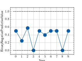 >>> from torch import rand, randint >>> # Example plotting multiple values >>> from torchmetrics.classification import BinaryNegativePredictiveValue >>> metric = BinaryNegativePredictiveValue() >>> values = [ ] >>> for _ in range(10): ... values.append(metric(rand(10), randint(2,(10,)))) >>> fig_, ax_ = metric.plot(values)