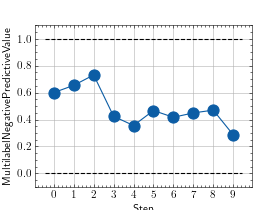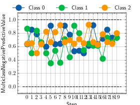 >>> from torch import rand, randint >>> # Example plotting multiple values >>> from torchmetrics.classification import MultilabelNegativePredictiveValue >>> metric = MultilabelNegativePredictiveValue(num_labels=3) >>> values = [ ] >>> for _ in range(10): ... values.append(metric(randint(2, (20, 3)), randint(2, (20, 3)))) >>> fig_, ax_ = metric.plot(values)