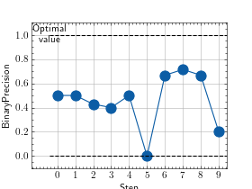 >>> from torch import rand, randint >>> # Example plotting multiple values >>> from torchmetrics.classification import BinaryPrecision >>> metric = BinaryPrecision() >>> values = [ ] >>> for _ in range(10): ... values.append(metric(rand(10), randint(2,(10,)))) >>> fig_, ax_ = metric.plot(values)