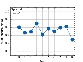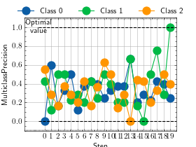 >>> from torch import rand, randint >>> # Example plotting multiple values >>> from torchmetrics.classification import MultilabelPrecision >>> metric = MultilabelPrecision(num_labels=3) >>> values = [ ] >>> for _ in range(10): ... values.append(metric(randint(2, (20, 3)), randint(2, (20, 3)))) >>> fig_, ax_ = metric.plot(values)
