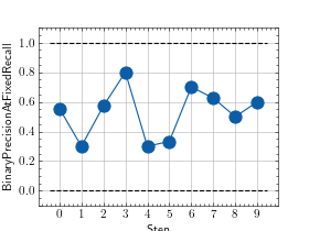 >>> from torch import rand, randint >>> # Example plotting multiple values >>> from torchmetrics.classification import BinaryPrecisionAtFixedRecall >>> metric = BinaryPrecisionAtFixedRecall(min_recall=0.5) >>> values = [ ] >>> for _ in range(10): ... # we index by 0 such that only the maximum recall value is plotted ... values.append(metric(rand(10), randint(2,(10,)))[0]) >>> fig_, ax_ = metric.plot(values)
