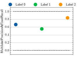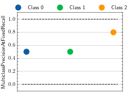 >>> from torch import rand, randint >>> # Example plotting a single value per class >>> from torchmetrics.classification import MulticlassPrecisionAtFixedRecall >>> metric = MulticlassPrecisionAtFixedRecall(num_classes=3, min_recall=0.5) >>> metric.update(rand(20, 3).softmax(dim=-1), randint(3, (20,))) >>> fig_, ax_ = metric.plot() # the returned plot only shows the maximum recall value by default