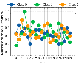 >>> from torch import rand, randint >>> # Example plotting a multiple values per class >>> from torchmetrics.classification import MulticlassPrecisionAtFixedRecall >>> metric = MulticlassPrecisionAtFixedRecall(num_classes=3, min_recall=0.5) >>> values = [] >>> for _ in range(20): ... # we index by 0 such that only the maximum recall value is plotted ... values.append(metric(rand(20, 3).softmax(dim=-1), randint(3, (20,)))[0]) >>> fig_, ax_ = metric.plot(values)
