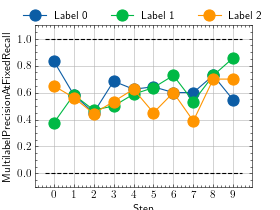 >>> from torch import rand, randint >>> # Example plotting multiple values >>> from torchmetrics.classification import MultilabelPrecisionAtFixedRecall >>> metric = MultilabelPrecisionAtFixedRecall(num_labels=3, min_recall=0.5) >>> values = [ ] >>> for _ in range(10): ... # we index by 0 such that only the maximum recall value is plotted ... values.append(metric(rand(20, 3), randint(2, (20, 3)))[0]) >>> fig_, ax_ = metric.plot(values)