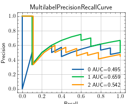 >>> from torch import rand, randint >>> from torchmetrics.classification import MultilabelPrecisionRecallCurve >>> preds = rand(20, 3) >>> target = randint(2, (20,3)) >>> metric = MultilabelPrecisionRecallCurve(num_labels=3) >>> metric.update(preds, target) >>> fig_, ax_ = metric.plot(score=True)