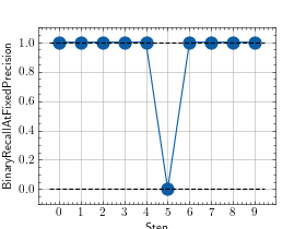 >>> from torch import rand, randint >>> # Example plotting multiple values >>> from torchmetrics.classification import BinaryRecallAtFixedPrecision >>> metric = BinaryRecallAtFixedPrecision(min_precision=0.5) >>> values = [ ] >>> for _ in range(10): ... # we index by 0 such that only the maximum recall value is plotted ... values.append(metric(rand(10), randint(2,(10,)))[0]) >>> fig_, ax_ = metric.plot(values)