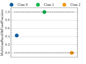 >>> from torch import rand, randint >>> # Example plotting a single value per class >>> from torchmetrics.classification import MulticlassRecallAtFixedPrecision >>> metric = MulticlassRecallAtFixedPrecision(num_classes=3, min_precision=0.5) >>> metric.update(rand(20, 3).softmax(dim=-1), randint(3, (20,))) >>> fig_, ax_ = metric.plot() # the returned plot only shows the maximum recall value by default