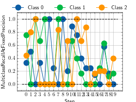 >>> from torch import rand, randint >>> # Example plotting a multiple values per class >>> from torchmetrics.classification import MulticlassRecallAtFixedPrecision >>> metric = MulticlassRecallAtFixedPrecision(num_classes=3, min_precision=0.5) >>> values = [] >>> for _ in range(20): ... # we index by 0 such that only the maximum recall value is plotted ... values.append(metric(rand(20, 3).softmax(dim=-1), randint(3, (20,)))[0]) >>> fig_, ax_ = metric.plot(values)