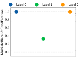 >>> from torch import rand, randint >>> # Example plotting a single value >>> from torchmetrics.classification import MultilabelRecallAtFixedPrecision >>> metric = MultilabelRecallAtFixedPrecision(num_labels=3, min_precision=0.5) >>> metric.update(rand(20, 3), randint(2, (20, 3))) >>> fig_, ax_ = metric.plot() # the returned plot only shows the maximum recall value by default