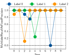 >>> from torch import rand, randint >>> # Example plotting multiple values >>> from torchmetrics.classification import MultilabelRecallAtFixedPrecision >>> metric = MultilabelRecallAtFixedPrecision(num_labels=3, min_precision=0.5) >>> values = [ ] >>> for _ in range(10): ... # we index by 0 such that only the maximum recall value is plotted ... values.append(metric(rand(20, 3), randint(2, (20, 3)))[0]) >>> fig_, ax_ = metric.plot(values)
