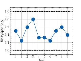 >>> from torch import rand, randint >>> # Example plotting multiple values >>> from torchmetrics.classification import BinarySpecificity >>> metric = BinarySpecificity() >>> values = [ ] >>> for _ in range(10): ... values.append(metric(rand(10), randint(2,(10,)))) >>> fig_, ax_ = metric.plot(values)