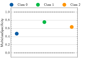 >>> from torch import randint >>> # Example plotting a single value per class >>> from torchmetrics.classification import MulticlassSpecificity >>> metric = MulticlassSpecificity(num_classes=3, average=None) >>> metric.update(randint(3, (20,)), randint(3, (20,))) >>> fig_, ax_ = metric.plot()