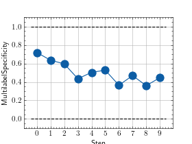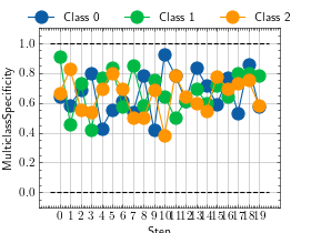 >>> from torch import rand, randint >>> # Example plotting multiple values >>> from torchmetrics.classification import MultilabelSpecificity >>> metric = MultilabelSpecificity(num_labels=3) >>> values = [ ] >>> for _ in range(10): ... values.append(metric(randint(2, (20, 3)), randint(2, (20, 3)))) >>> fig_, ax_ = metric.plot(values)