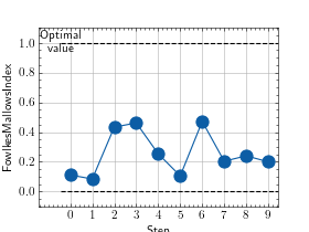 >>> # Example plotting multiple values >>> import torch >>> from torchmetrics.clustering import FowlkesMallowsIndex >>> metric = FowlkesMallowsIndex() >>> values = [ ] >>> for _ in range(10): ... values.append(metric(torch.randint(0, 4, (10,)), torch.randint(0, 4, (10,)))) >>> fig_, ax_ = metric.plot(values)