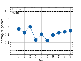 >>> # Example plotting multiple values >>> import torch >>> from torchmetrics.clustering import HomogeneityScore >>> metric = HomogeneityScore() >>> values = [ ] >>> for _ in range(10): ... values.append(metric(torch.randint(0, 4, (10,)), torch.randint(0, 4, (10,)))) >>> fig_, ax_ = metric.plot(values)