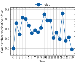 >>> # Example plotting multiple values >>> import torch >>> from torchmetrics.detection import CompleteIntersectionOverUnion >>> preds = [ ... { ... "boxes": torch.tensor([[296.55, 93.96, 314.97, 152.79], [298.55, 98.96, 314.97, 151.79]]), ... "scores": torch.tensor([0.236, 0.56]), ... "labels": torch.tensor([4, 5]), ... } ... ] >>> target = lambda : [ ... { ... "boxes": torch.tensor([[300.00, 100.00, 315.00, 150.00]]) + torch.randint(-10, 10, (1, 4)), ... "labels": torch.tensor([5]), ... } ... ] >>> metric = CompleteIntersectionOverUnion() >>> vals = [] >>> for _ in range(20): ... vals.append(metric(preds, target())) >>> fig_, ax_ = metric.plot(vals)