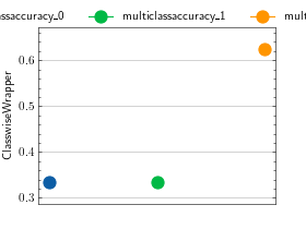 >>> from torch import randint, randn >>> from torchmetrics.wrappers import ClasswiseWrapper >>> from torchmetrics.classification import MulticlassAccuracy >>> metric = ClasswiseWrapper(MulticlassAccuracy(num_classes=3, average=None)) >>> preds = randn(10, 3).softmax(dim=-1) >>> target = randint(3, (10,)) >>> metric(preds, target) {'multiclassaccuracy_0': tensor(0.5000), 'multiclassaccuracy_1': tensor(0.7500), 'multiclassaccuracy_2': tensor(0.)}